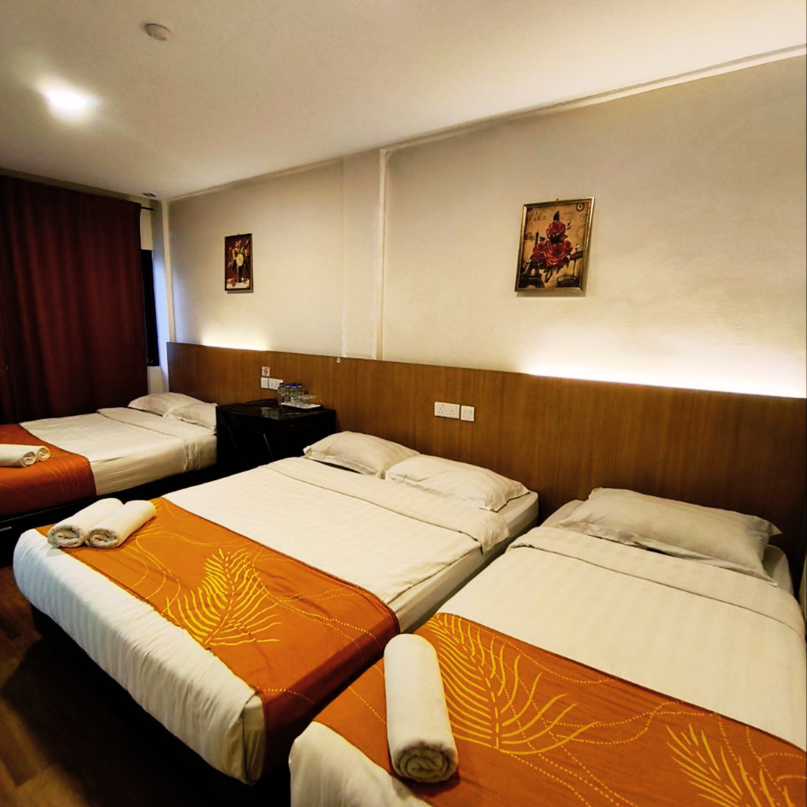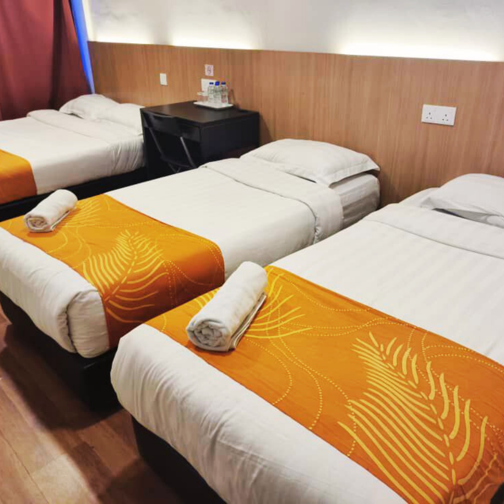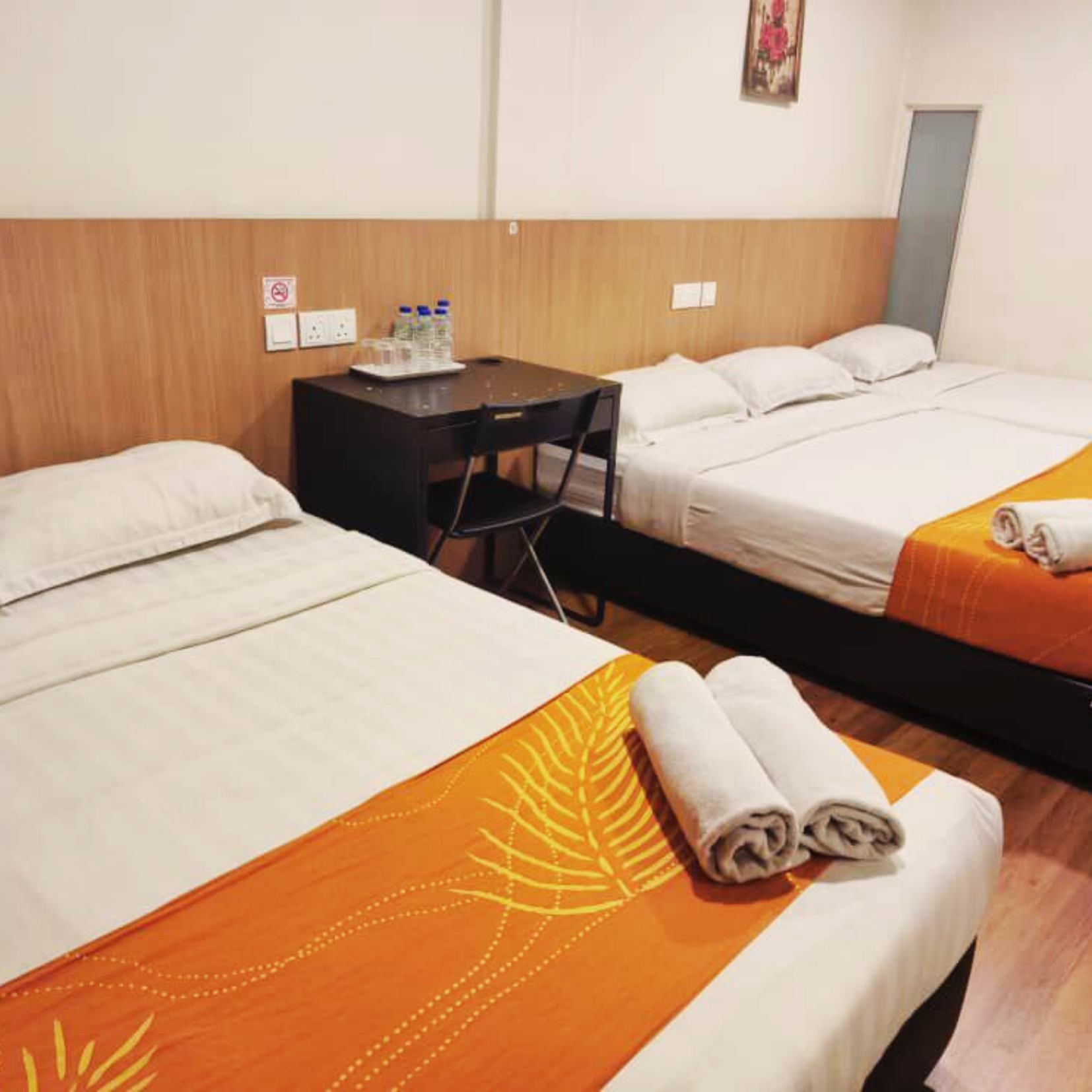 2 queen bed and 1 single bed, private bathroom, TV, study desk, air conditioning, water heater, hair dryer, iron & ironing board, & view window.