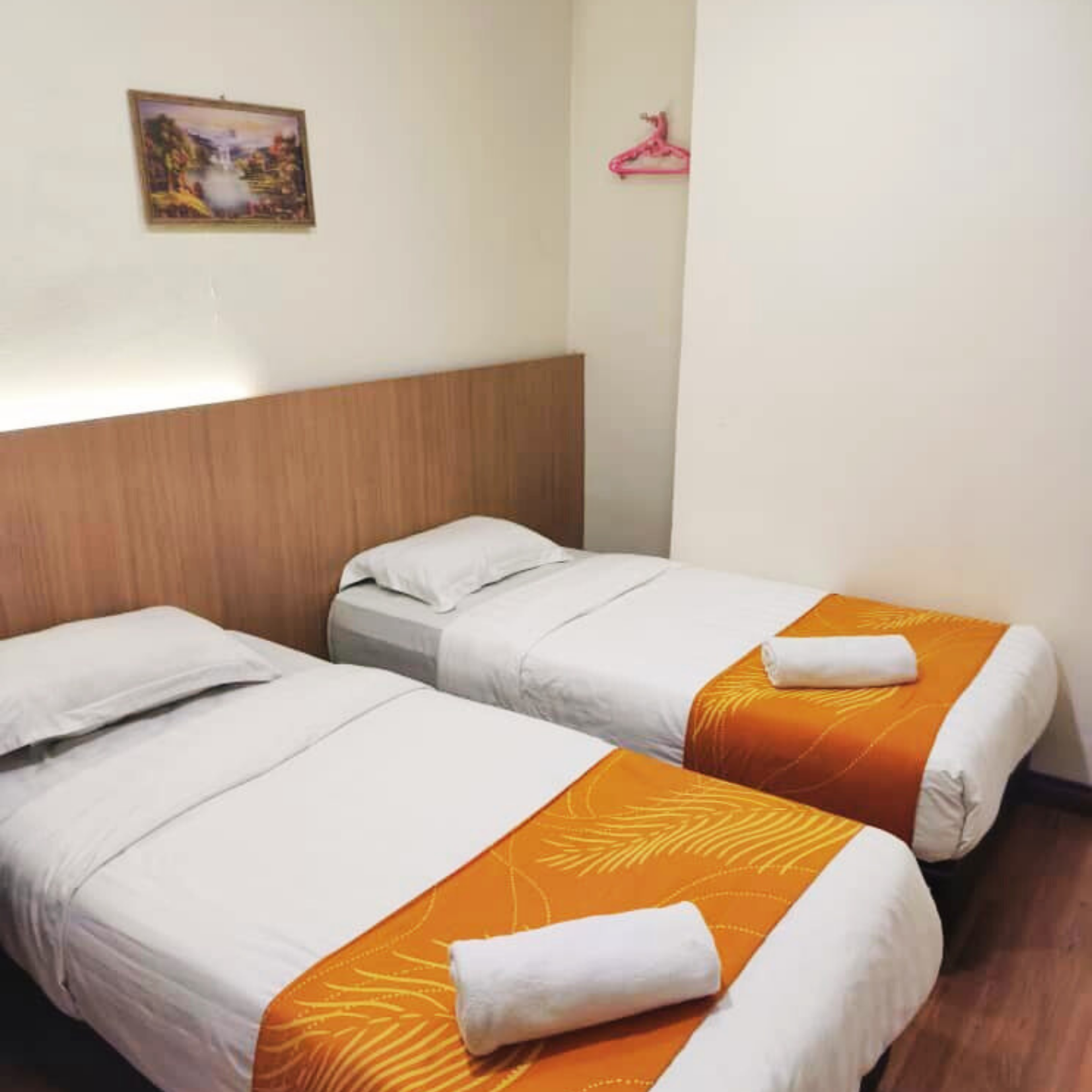 1 queen bed and 2 single bed, private bathroom, TV, study desk, air conditioning, water heater, hair dryer, iron & ironing board, & view window.